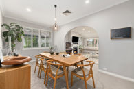 * High ceilings, zoned ducted air con, gas heating outlet and timber Venetian shutters line the north windows