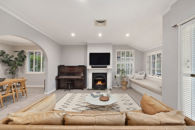 * Generous light-filled living space with an open fireplace opens to a sunny north verandah with leafy district views